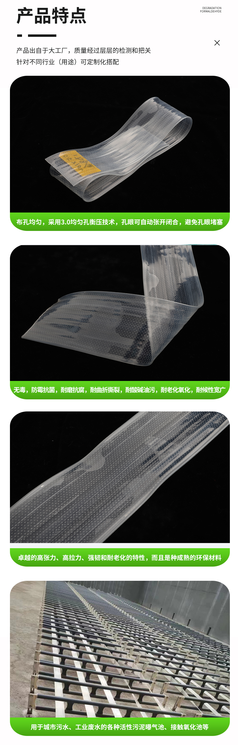 曝氣軟管是引進西德技術開發成功的新型增氧曝氣器。薄壁、直通道極大降低了曝氣阻力損失;可變孔及狹縫自動開閉,徹底解決了曝氣器的堵塞問題;軟管為線狀曝氣,使布氣均勻,并形成豎向環流,攪拌混合更均勻;氣泡小,氧利用率和動力效率高。
