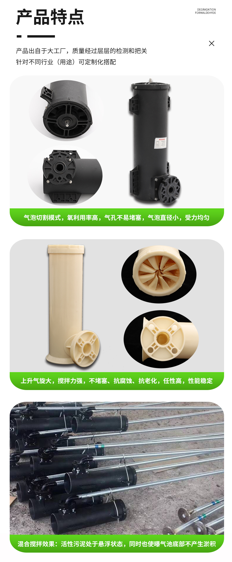 可升降旋流曝氣器整體由尼龍66+30%玻璃纖維制成,,具有較高的耐腐蝕性。其高度為42厘米,內徑為12厘米,進氣口中心距曝氣頭底部5厘米。