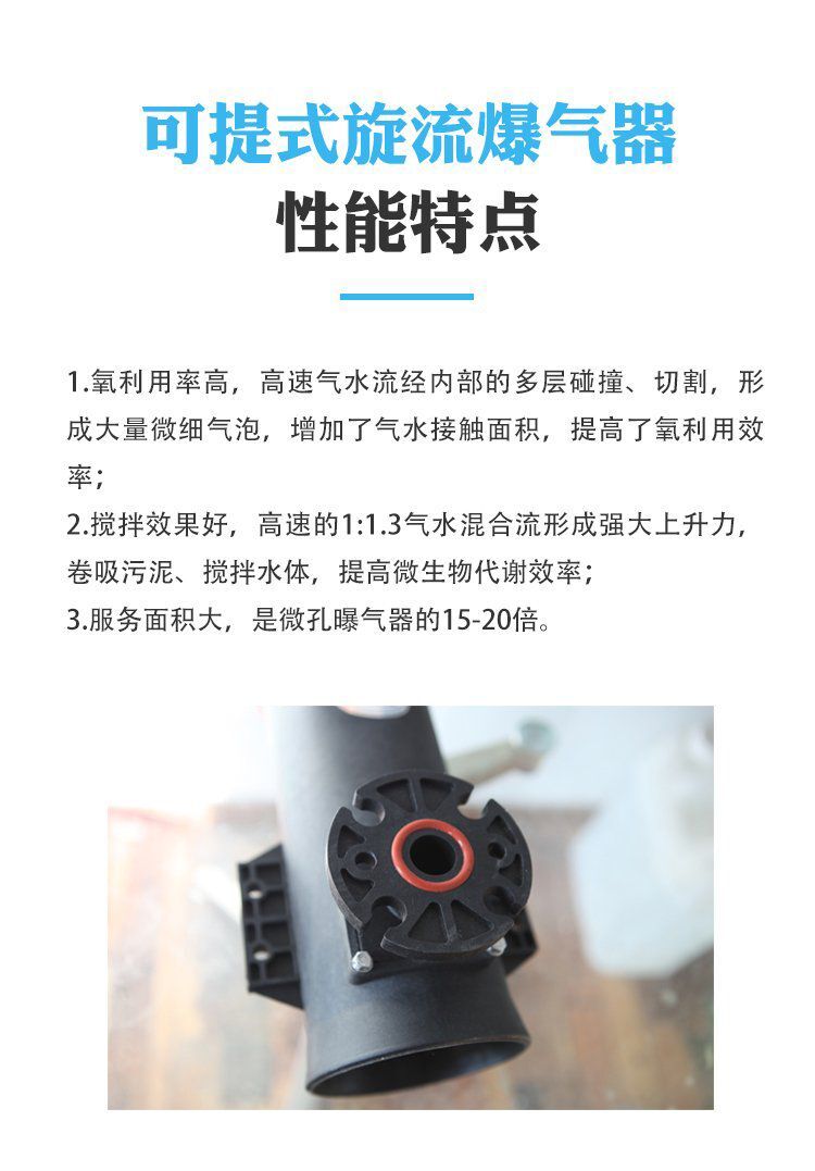 旋流曝氣器主要由外筒、進氣管、回流板、楔形結構四部分組成,可提升旋流曝氣器溶氧效率高,壓力損失小,攪拌能力強,不堵塞,池底不積泥,,免維護,間歇運行,使用壽命長;與傳統的螺旋曝氣器、發散式曝氣器、穿孔管曝氣器相比,可升降旋流曝氣器的能耗可降低25%以上。