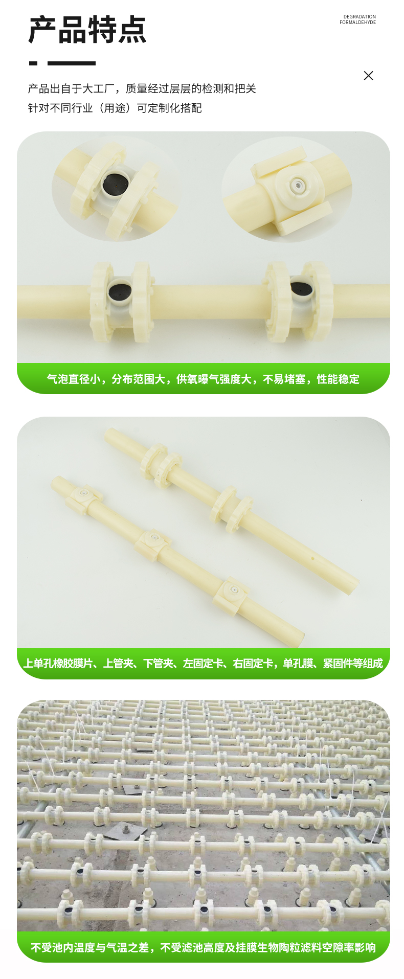 單孔膜曝氣器,是BAF曝氣系統中的重要部件,能為好氧微生物提供充足的溶解氧。單孔膜曝氣器不受池內溫度與氣溫之差,不受濾池高度及生物陶粒濾料空隙率影響,氣泡直徑小,分布范圍大,曝氣器出氣口設計有獨特的凹凸結構,不易被堵塞,不怕生物陶粒濾料堆壓。由于其結構特殊,所以在安裝、使用中需要按照相關要求進行操作。