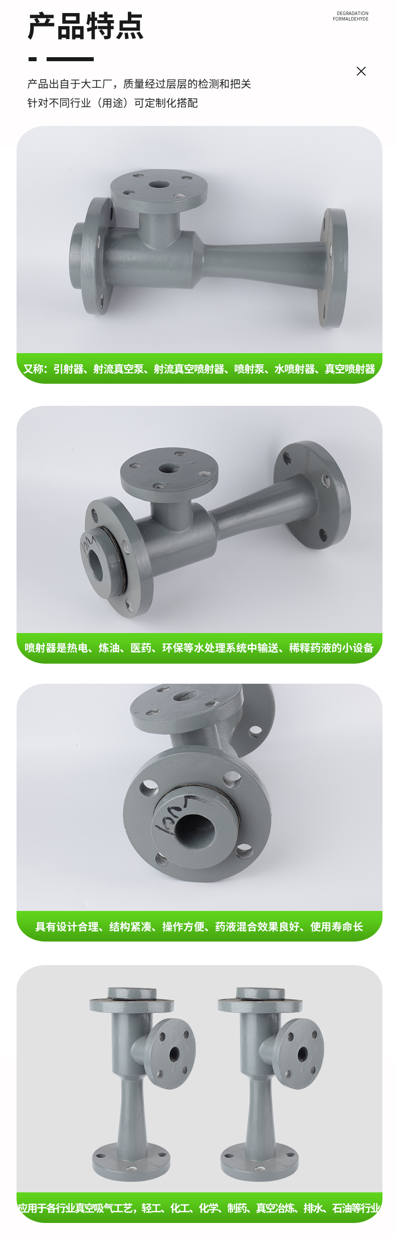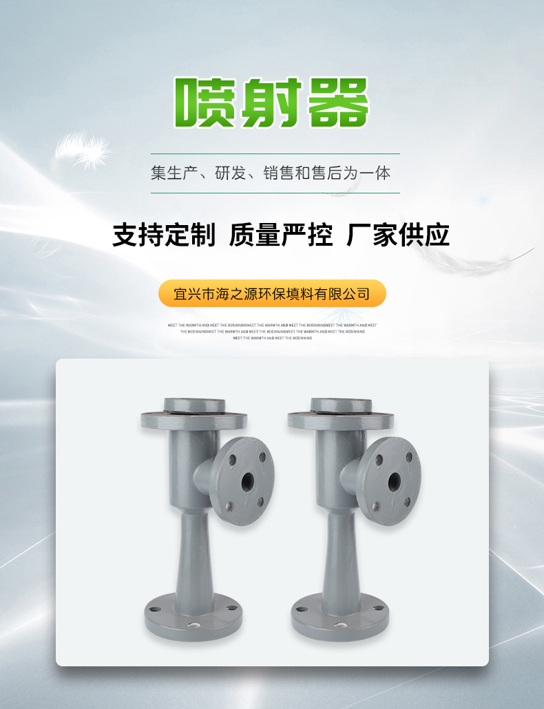 噴射器--原WGP型,適用藥液:鹽酸、堿 。噴射器是熱電、煉油、醫藥、環保等水處理系統中輸送、稀釋藥液的小設備,具有設計合理、結構緊湊、操作方便、藥液混合效果良好、使用壽命長等優點。調節濃藥液進口閥門及調節墊片的厚度,使出口藥液達到所要濃度。注意:安裝時需要特別注意噴射器法蘭與鐵法蘭之間的平行度和垂直度。