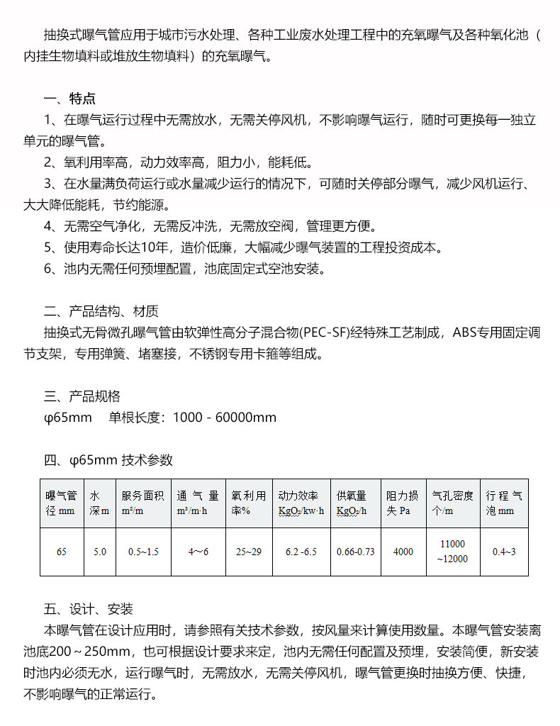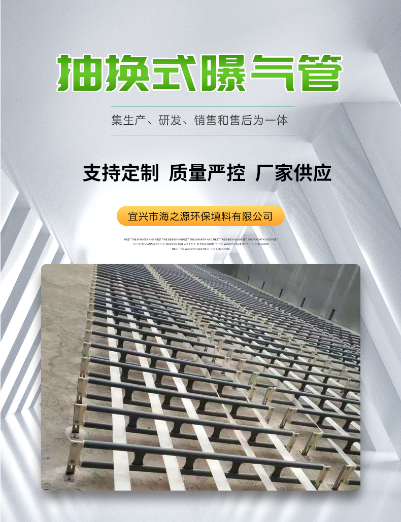 抽換式無骨微孔曝氣管由軟彈性高分子混合物(PEC-SF)經特殊工藝制成,ABS專用固定調節支架,專用彈簧、堵塞接,不銹鋼專用卡箍等組成。